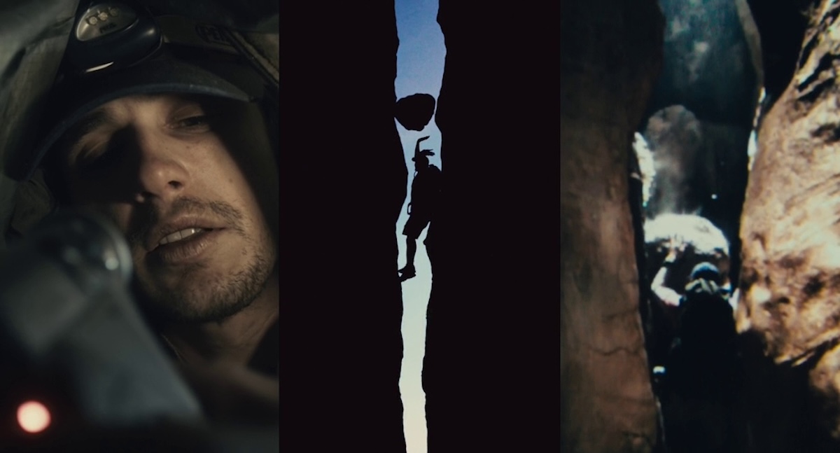 Whereas some lesser filmmakers may have struggled to create a visually arresting and dynamic film about one man trapped in a single location, this obviously proved to be no problem for Boyle’s usual inventive genius as the finished film doesn’t let up from frame one. The opening intro set against the thumping track Never Hear Surf Music Again by Free Blood is a multi-screen combo of sped-up films showing human activity en masse: workers commuting; traders on Wall Street; pilgrims in Mecca; various sporting events. However, amongst all this montage of humanity, we then observe a screen showing a solitary figure going about his flat as he’s getting ready for some excursion—it is, of course, our protagonist Aron Ralston (James Franco).