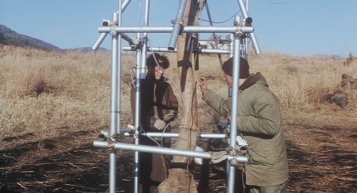 Scorched and disorientated by day, he finds himself in a liminal part of the forest where a single sickly tree, supported by scaffolding, clings to life. In this cursed woodland, young trees fall at random as roots rot and vegetation withers. A team from the environmental department, led by Nakasone (Ren Ôsugi), is studying the area to find the cause of the dieback; they suspect the lone tree, which appears to be unique. However, a young loner named Kiriyama (Hiroyuki Ikeuchi) is prepared to use violence to defend the tree and keep others away.