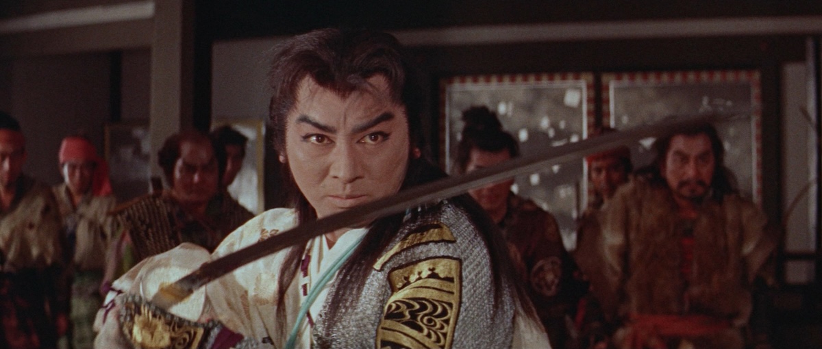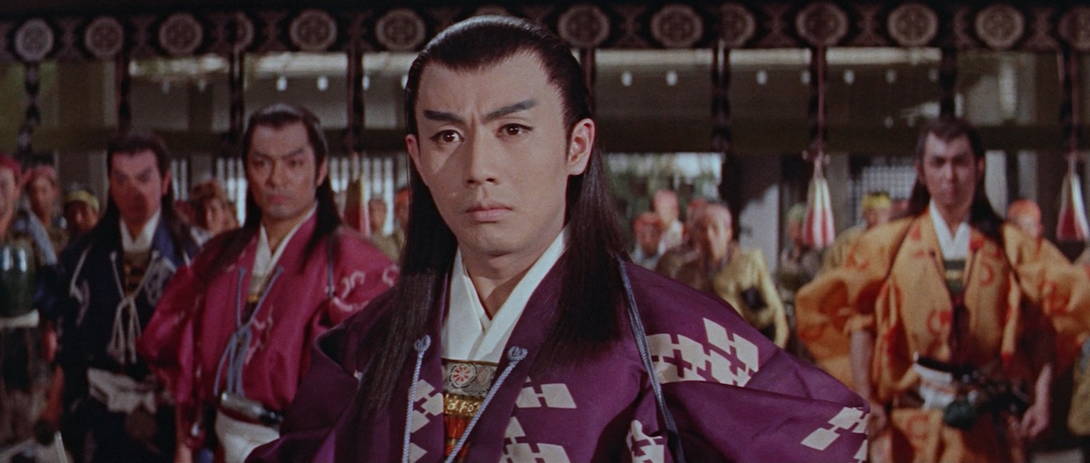 The film opens with some striking kabuki-style mechanical effects as sections of the set disassemble and move aside to facilitate scene changes instead of edits. We are introduced to The Four Heavenly Kings: Sakata no Kintoki (Kôjirô Hongô), brandishing his signature huge axe; Urabe no Suetake (Narutoshi Hayashi), a master of the bow; Usui no Sadamitsu (Ryûzô Shimada) and Watanabe no Tsuna (Shintarô Katsu), who both seem comfortable with their katana. The four legendary heroes are joined by the lone warrior, Hirai no Yasumasa (Jun Negami), and the general of the Genji samurai, Minamoto no Yorimitsu (Raizô Ichikawa), also known as Lord Raikô.