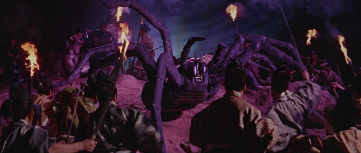 Toho’s kaiju franchise that followed the surprise success of Godzilla (1954) was a major challenge to Daiei, who make a brave attempt to do something similar here. They don’t take the man-in-rubber-suit route but create a couple of excellent human-scale puppets. One is the totally reimagined demonic form of the Kidomaru (Toshio Chiba) that resembles a rhinoceros crossed with an ox, which can fly.