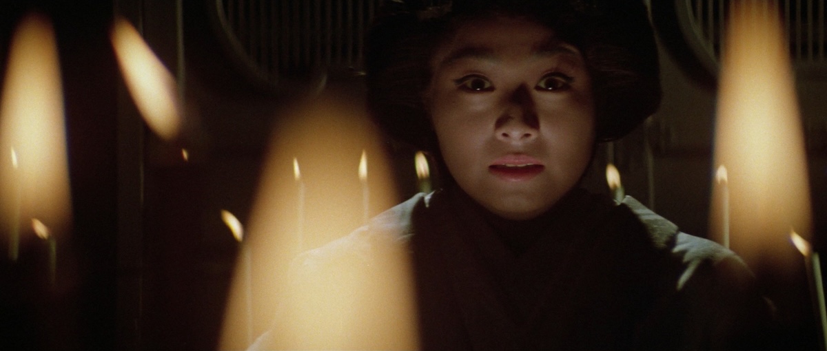 The cinematography of Hiroshi Imai is outstanding, particularly the painterly use of deep chiaroscuro. To fully appreciate some of the inventive shots as intended, one needs to have a very big screen or sit very close to the television with all the lights out. In some scenes, the screen is left mainly dark with the lamp-lit action confined to a small area as the viewpoint tracks slowly across. In a darkened auditorium, the ghostly scene would seem to hover, moving through space in a way that would dissolve the obvious barrier of the screen. The events appear to occur in a boundless space that the viewer shares—an inspired exploitation of cinematic language.