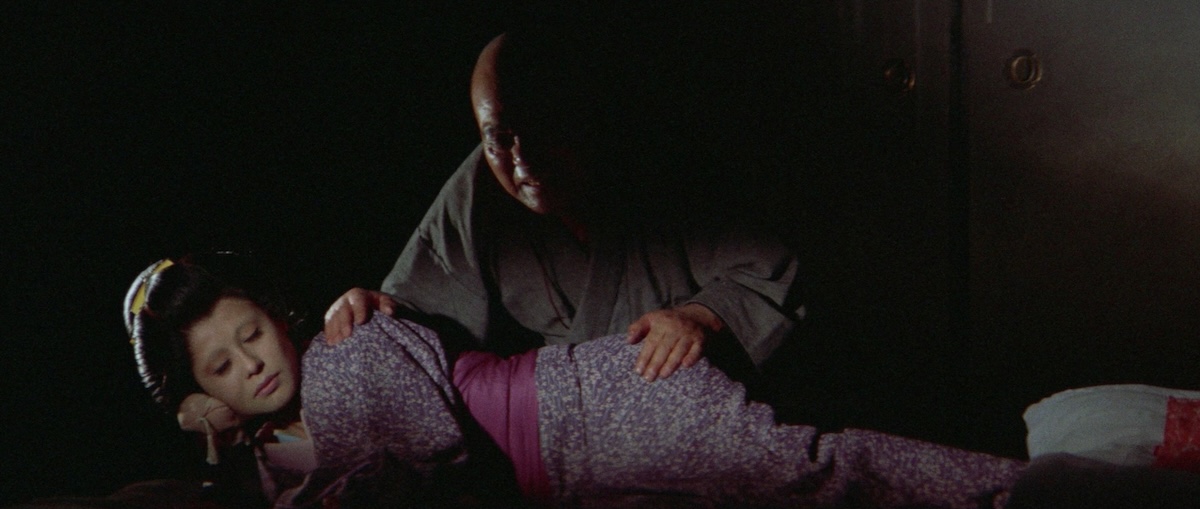 The film opens with the aftermath of a seemingly unrelated double murder of a naked woman and her lover, still partially tangled in blood-soaked sheets. Blind rent collector Soetsu (Kenjirô Ishiyama) simply turns back when he hears the name of the dead man. We next see him at home with his two daughters, the good Osono (Matsuko Oka) who still lives with him, and the runaway Oshiga (Maya Kitajima) who has returned to ask for the loan of a substantial sum of money. She won’t say what she needs it for, but we later find out she intends to buy the debts of the madame of the brothel where she now works, so she can take over. Soetsu flatly refuses her request.
