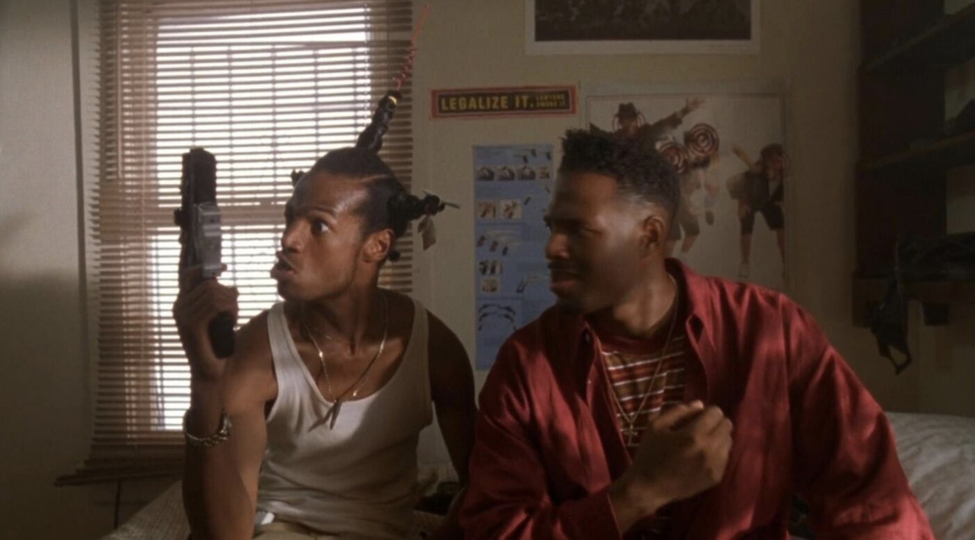 Don’t Be a Menace to South Central While Drinking Your Juice in the Hood marked Paris Barclay’s feature directorial debut—and his only film directing credit to date. More significantly, it signalled the emergence of Shawn and Marlon Wayans as cinematic screenwriters. Years before their long-running Scary Movie franchise and the 2000s comedy classic White Chicks (which also has a sequel underway), the pair mined “hood classics” for their unique brand of chaotic social satire. Boyz N the Hood (1991) and Menace II Society (1993) were the primary targets of their parody, with numerous sequences directly lampooning scenes from these two templates of 1990s African American cinema.