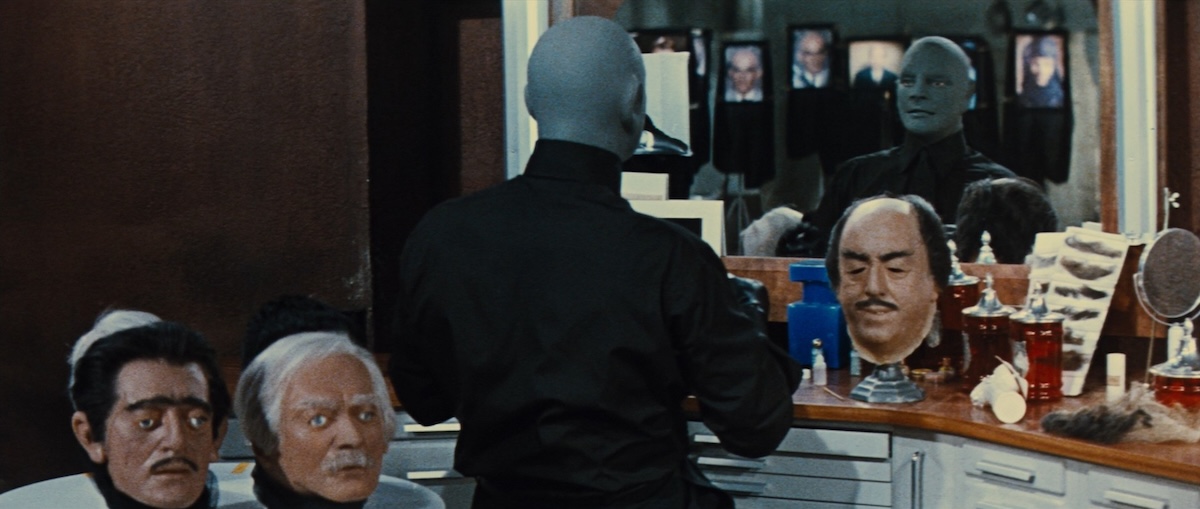 Fandor wakes up in an underground lair resembling the vaulted catacombs of a gothic cathedral, where Fantômas makes his entrance heralded by a burst of grandiose organ music. This brings to mind The Abominable Dr Phibes (1971), who would take the organ-accompanied entrance to a yet more grandiose level. Phibes readily sits in a shared lineage with Fantômas as an elusive supervillain, capable of orchestrating overly elaborate and deadly scenarios and always outwitting his pursuers. Also, the extensive use of realistic masks. In the case of Phibes, this is to look more like his old self. For Fantômas, it’s always for the purpose of deception. In his original pulp fiction manifestation, he would often take on the likeness of his murdered victims and was said to have no face of his own. Here, when not in disguise, he wears a bald, blank blue mask that I think must have been the inspiration for the performance-art collective known as The Blue Man Group, formed in late-1980s New York.