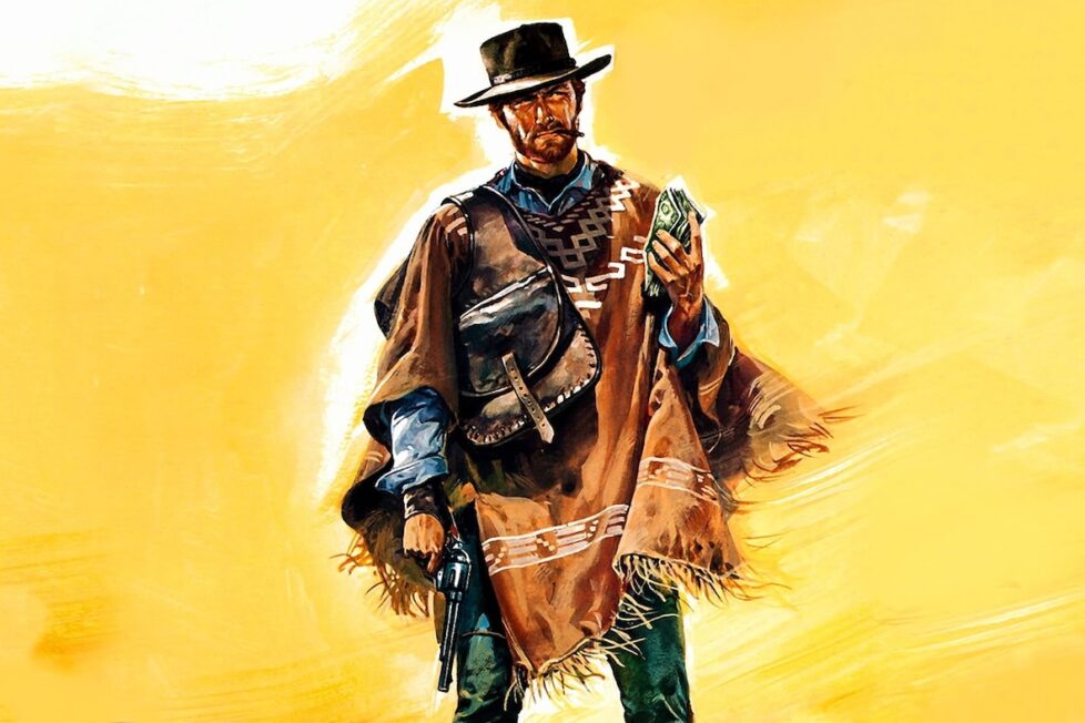 From the very first frame, it’s clear that A Fistful of Dollars is no ordinary Western movie. It opens with animated smoke rings blowing through a blood-red screen while an acoustic guitar plays a delicate yet sinister chord arrangement. A solo whistler joins in with a lonely melody (a variation on a 1940s hit song “Ghost Riders in the Sky”), as a rotoscoped horseman gallops jerkily across the screen.