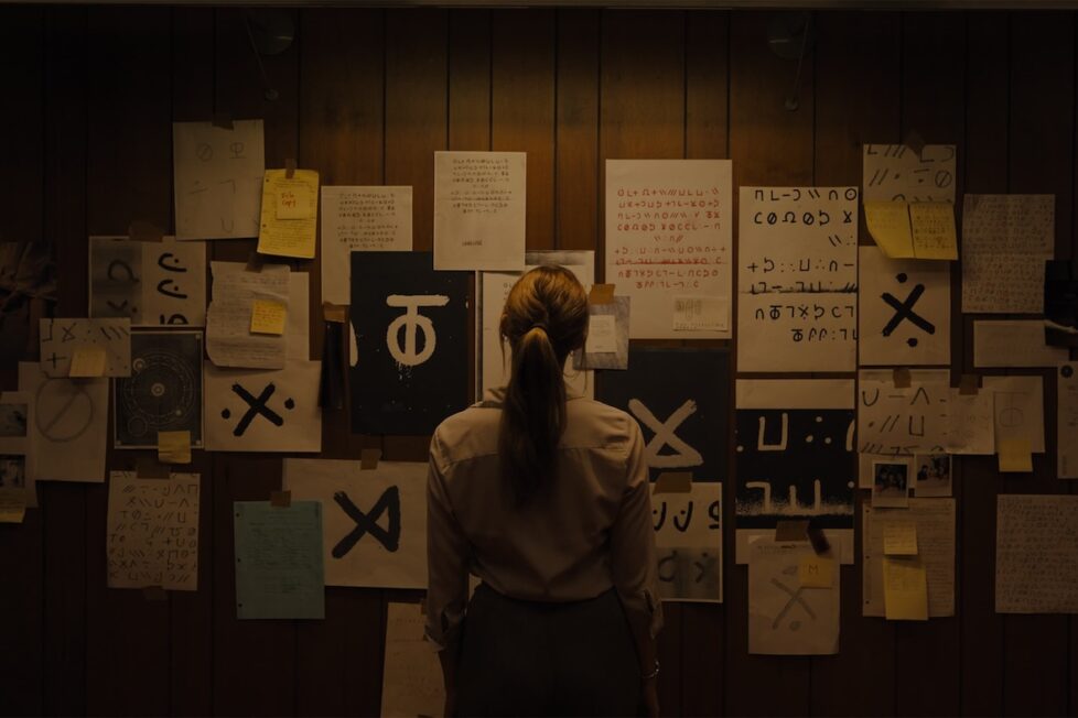 The diegetic sound design crafted by Eugenio Battaglia (Hello Destroyer) complements the nightmarish visuals and enhances the film’s unflinching outlook. Prominent rock songs like T. Rex’s “Bang a Gong (Get It On)” are juxtaposed with a cacophony of harrowing screams raised to an almost assaultive level. Meanwhile, sinister whispers emanate from nowhere, providing a sonic dissonance to the most unassuming moments. Instances of supposed normalcy become insufferably tense as Harker falls down the rabbit hole, deciphering Longlegs‘ enigmatic language and cracking occult puzzles. This combination intelligently elevates the blasphemous brutality lurking beneath the surface, heightening the simmering tensions developing between the characters.