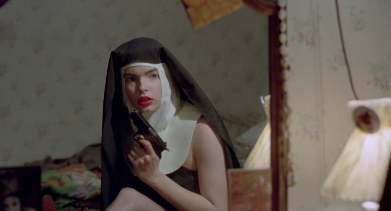 Within this landscape, Thana emerges as a symbol of the silences and brutalised feminine experience. She’s unable to scream during her assaults, she cannot articulate her trauma to her work colleagues, nor can she demand justice in a society deaf to women’s pain. Her voicelessness represents the systematic indifference that surrounds her and is an indictment of a culture that refuses to hear female anguish. When Thana takes up the .45-calibre pistol and begins her violent metamorphosis, she’s speaking through action. The weapon becomes her voice, and each shot fired functions as a syllable of a language forged from rage. The violence she imposes is a reflection of the brutality she has endured in a world that communicates with her through domination and cruelty. Therein lies the brilliance of Ms .45; it transcends the garish confines of exploitation cinema, emerging as a bleak moral enquiry into the enforced silence of sexual assault survivors, and by extension, women in general.