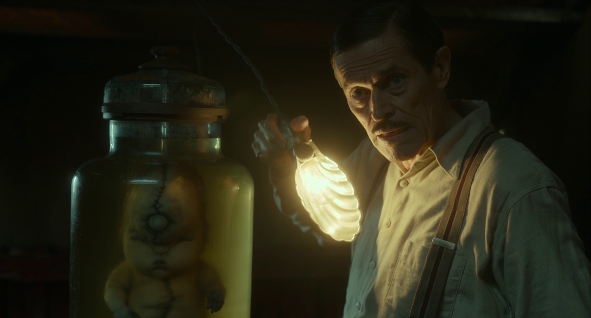 Reflecting Stanton’s moral and psychological unravelling, Nightmare Alley is carefully structured as a diptych of two distinct yet thematically entwined halves mirroring his doomed ascent and fall. The first half unfolds in the 1930s, following Stanton’s entrance into the murky and claustrophobic world of the travelling carnival. Within this milieu, del Toro reaffirms his reputation as a consummate storyteller, conjuring a realm steeped in his profound fascination with damaged souls and grotesque beauty. Production designer Tamara Deverell’s (Priscilla) realises this vision with exquisite precision, crafting a hauntingly beautiful pastiche of tattered circus tents, glowing Ferris wheels, and sideshow curiosities. Wonder can be found within some decorations such as the electric chair Stanton fashions for Molly. Whereas Clem’s (Willem Dafoe) gruesome specimens preserved in jars of formaldehyde provide a chilling reminder of the cruelty underpinning the spectacle. Every frame looks simultaneously breathtaking and ominous, brought to life with the filmmaker’s traditional macabre enthusiasm.