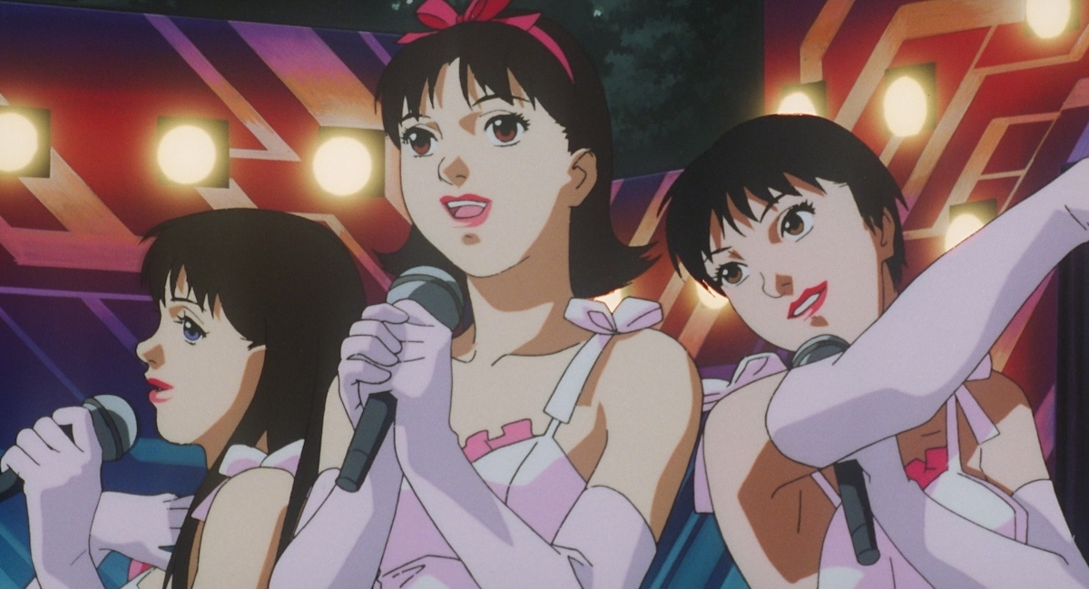 After a scene that could be from any number of generic anime series, featuring three colour-coded ‘Powertron’ rangers in clinging jump suits and helmets, we find ourselves at some sort of well-attended anime convention and drop into a narrative that’s already well underway. We know from the posters displayed as background details that the main attraction is the J-Pop trio CHAM! Dressed in typically doll-like attire, short skirt and baby pink frills, Mima Kirigoe (voiced by Junko Iwao), introduces the final number with the announcement that it will be their last song together, explaining that she is graduating from the idol group. She implores the fans to continue their support for CHAM! as well as following her new career as an actress.