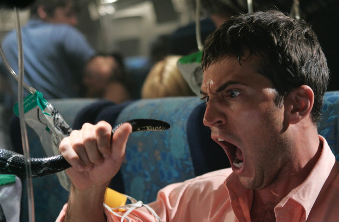 The sequences involving the titular serpents rampaging through the cabin also produce some enjoyable moments that effectively escalate the horror. Brought to life through an interplay of animatronics and digital effects, the snake attacks are creatively gory and executed with precision. A yapping Chihuahua is swiftly dispatched by a viper, while another unfortunate passenger is consumed whole by an enormous Burmese python. A particular gruesome highlight unfolds in the aircraft restroom, where a lecherous couple attempts to join the “Mile High Club”, only to be abruptly ambushed by a vicious copperhead. Admittedly, the exaggerated violence is highly improbable, and the early-2000s digital effects oscillate between serviceable and conspicuously artificial. However, Ellis’s assured hand ensures the horror retains a jagged edge that rarely allows the 100-minute runtime to stagnate.