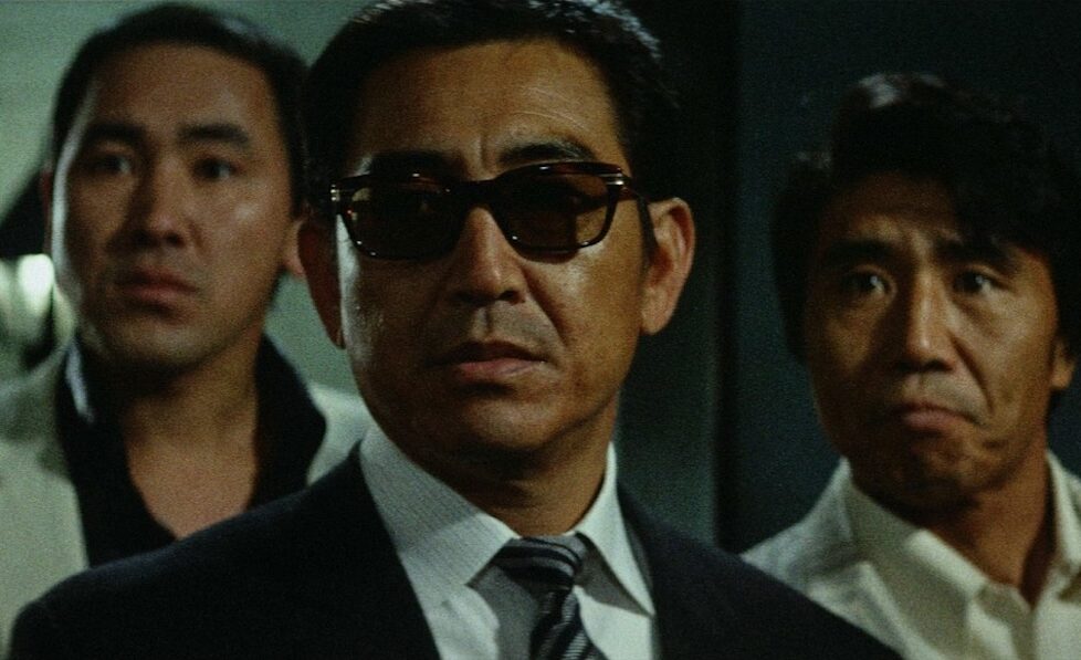 The standout jazz score by Takeo Yamashita counterpoints what might otherwise be mistaken for a period setting: a man walks alongside a high, seemingly fortified white wall. All we see at first are his feet kicking through fallen leaves, clad in what appear to be traditional waraji sandals. It’s as if he’s stepped out of a bygone era, and in many ways, he has. The helpful on-screen text introduces him as Masuo Gunji (Kôji Tsuruta), the ex-chief of the Hamamura Family. His voiceover tells us he’s just completed a 10-year prison sentence. The two men waiting to greet him are his right-hand man, Ozaki (Asao Koike), and Shark (Hideo Murota). The film explores the strength of their fraternal bonds as they demonstrate unwavering loyalty to each other in a world where betrayal is commonplace. Like most of the cast, these actors are part of the Toei Studios ensemble, familiar faces to fans of Japan’s genre cinema.