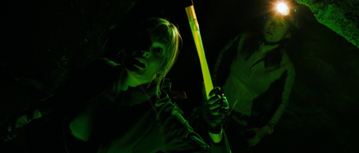 As much as this film so far’s been anything but boring, it now moves up a gear as we see the group begin their journey and head underground. Thanks to cinematographer Sam McCurdy and production designer Sam Bowles, the caves featured in the film look brilliantly real, when in fact it was all filmed on sets designed at Pinewood Studios. McCurdy’s expert use of lighting manages to utilise torchlight, green glow-sticks, red flares, and night-vision video camera to such a degree that you never lose sight of the actors as they navigate through their dark subterranean environment. Regarding the caves, due to the film’s low-budget, 21 separate sets were designed and built, then reused with different lighting, camera angles and set dressings to give the illusion of this vast cavernous interconnected cave system. The end result: with these technical tools employed so well, not once do you ever think that this is all taking place on a soundstage.