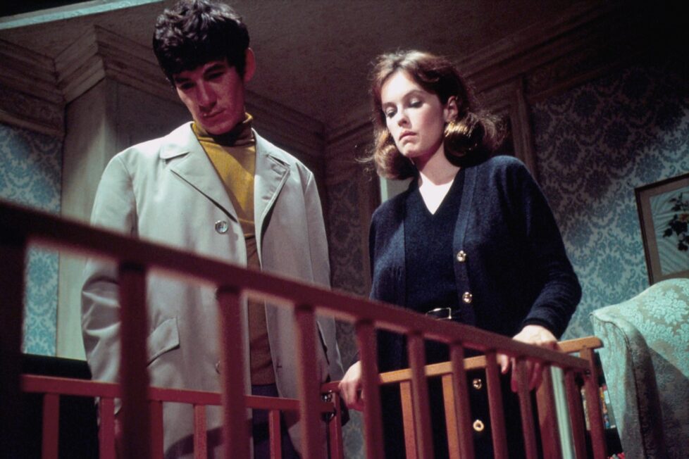 Here the film—which mostly follows The Millstone pretty closely—departs from the novel in a small but significant way. Homosexuality was no longer a completely taboo subject but was still considered a bit beyond the pale for mainstream British film to deal with; it was less than a decade since Basil Dearden’s groundbreaking Victim (1961). Indeed, as was so common, A Touch of Love treats George’s sexuality through hints and winks rather than defining it outright. McKellen’s slyly subversive expressions speak volumes; Rosamund asks him (in a non-sexual context) “You lead a double life?”, and when she says she wants to know all about him, he asks “What do you mean, ‘all’?”.