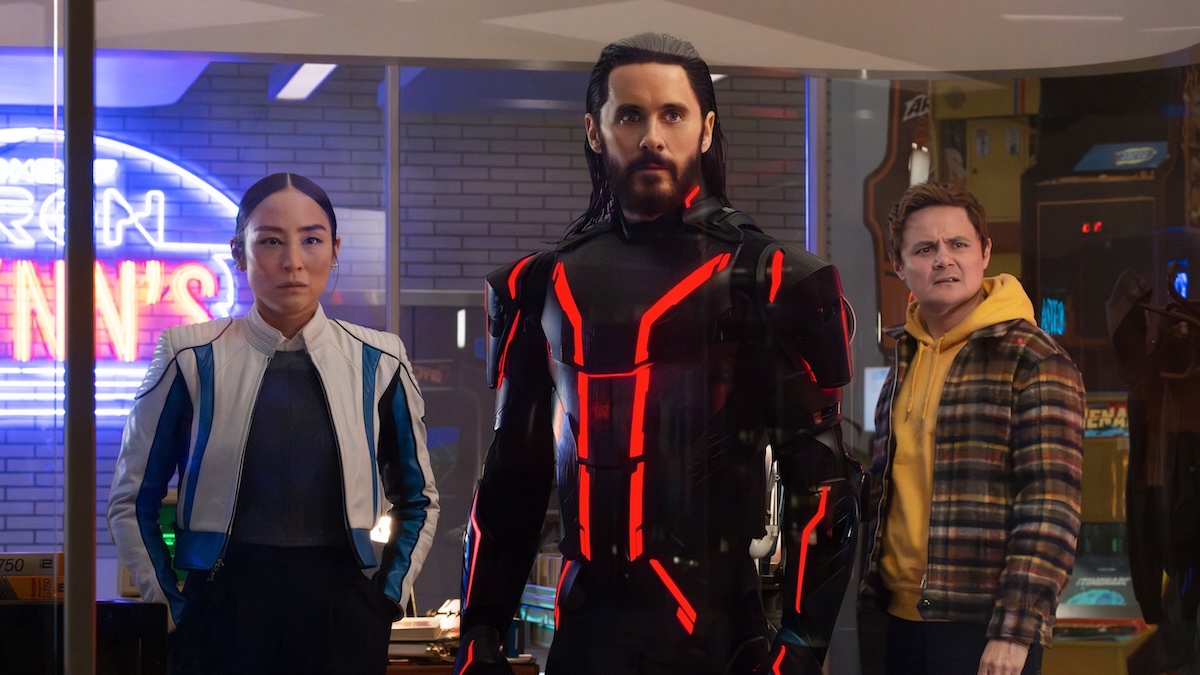 The story, for what it’s worth, picks up 15 years after Tron: Legacy. ENCOM and Dillinger Systems, now led by Julian Dillinger (Evan Peters), are both in a technological race to bring digital life into reality with a permanence that currently eludes both parties. Julian posits a future full of A.I. armies and high-tech vehicles that can be 3D-printed into existence, then replaced almost instantly should they perish, with no loss of human life, but nothing he creates can last beyond 29 minutes. And that includes the eponymous Ares (Jared Leto), the new ‘Master Controller’ program, whom he wants to showcase as the ultimate expendable soldier.