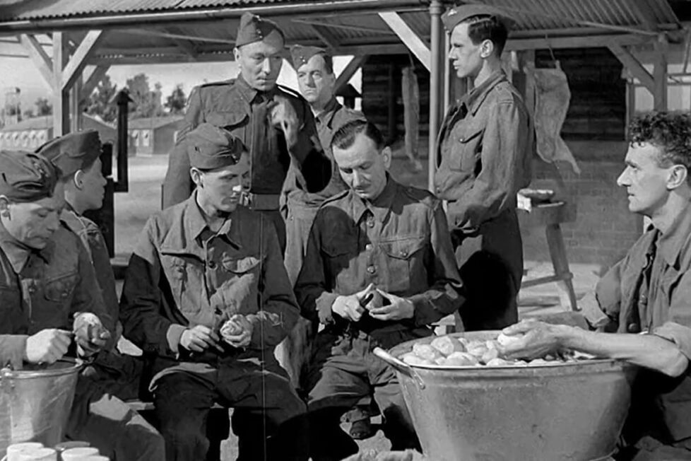 In Crewe railway station, thronged with servicemen on leave or returning to base, an encounter between this motley crew and some real soldiers doesn’t go entirely smoothly. So it’s an unpleasant surprise when they arrive at their camp to discover their NCO, Sergeant Fletcher (Hartnell), is one of the men they riled at the station. Conflicts between him and some of the recruits continue throughout the long basic training section of the film that follows—with scenes on the parade ground and in the billet, on an assault course and peeling potatoes. Indeed, Fletcher, very convincingly played by Hartnell, clearly embodies the army as a whole as well as being a believable individual. At first, we see him from the recruits’ perspective, as hostile, and only later realise that he’s quite fair. His relationship with Niven’s lieutenant, nominally his superior but less experienced in military matters and perfectly aware of it, is also carefully observed.